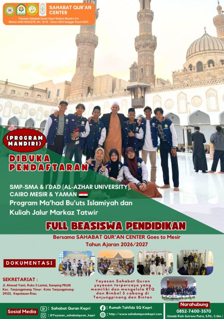 Sahabat Qur’an Kepri merupakan lembaga Tahfidz Al-Qur’an dan Kursus Bahasa Arab yang bergerak sebagai mediator pendidikan para pelajar Indonesia yang ingin belajar di Timur Tengah mulai dari jenjang SMP, SMA hingga kullah di Universitas.